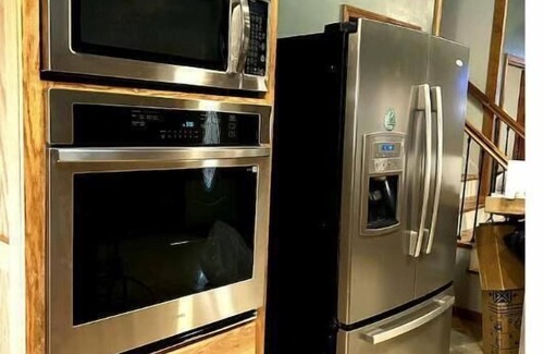 The kitchen features a counter-top stove, in-wall oven, and commercial grade microwave! Our fridge is stocked with fresh water for you as well! All pots, pans, and utensils are included!