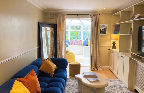 Situated in the centre of the property, this space is literally the heart of the home. The kitchen's hardwood floors, grey cabinetry and wooden worktops exude a tasteful Farmhouse decor, while the contemporary comforts of the living area add a touch of vibrant modernity. Take full advantage of the quality appliances and cookware - including a handy Nespresso coffee machine, to cook up a storm! Alongside the kitchen, you'll be taken aback by the funky electric blue sofa and coffee table that centres the space, in perfect keeping with the stylish mould of the local area.