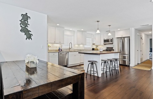 Gorgeous 4 bedroom 3 bath home with pool! Great for large families or groups! Beautiful paved pool deck with plenty of room to enjoy the Florida sun! Enjoy the refreshing 28' long pool with a 6' X 18' sun shelf after a day on the beach. As you pull into the circular driveway you will find parking for 5-6 cars. This beautiful home has been completely renovated and updated.