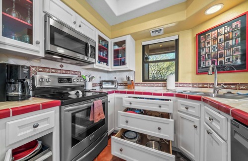 From the red tiles on the floor to the desert colored stucco walls and decor, this quiet condo is an ideal spot for a short or long stay giving you the full feel of a southwest get away. Pick up some groceries from the store down the street and cook your own meals in the fully furnished kitchen or visit some of the many restaurants in the area. No matter which room you're in, there is a breathtaking view to enjoy. Watch the twinkle of the city lights at night or the sunshine off of the majestic mountains. Access the Ventana Canyon hiking trail behind the complex, spend the day by the pool, or stay in and enjoy the Smart TV; no matter your interests there is something for you here.