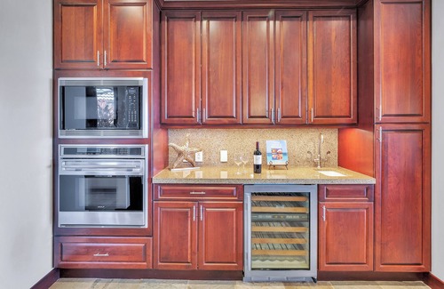The well stocked gourmet kitchen is a cooks dream with cherry cabinets and granite counters. It is equipped with a Wolf six burner gas range, Wolf oven and microwave, Sub-Zero Refrigerator, and small appliances such as blender, rice maker, coffee maker, electric kettle and popcorn maker. The outdoor cooking center on the lanai also houses granite counters, a Wolf six burner grill complete with rotisserie and a small refrigerator.