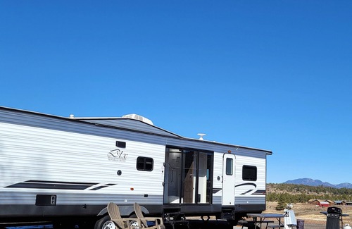Your luxurious Grand Canyon RV Glamping experience awaits. We are located in the town of Williams, Arizona. The "Gateway to the Grand Canyon" and the location for the Grand Canyon Railway. We are a 54 mile drive to the Grand Canyon and prepared for any season! Bring your friends and family members to experience the outdoors in style at our Boutique Glamping Resort. This is a 2 Queen Bedroom, 1 Sofa Bed, and 2 FULL bathroom camper unit. This unit has heating, air conditioning, a fireplace inside, and a full working kitchen! Your home away from home. This unit has a Smart TV, deck, chairs, a grill, and a fire pit.