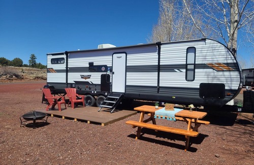 Welcome to our Mini Bunkhouse Suite! Your luxurious Grand Canyon RV Glamping experience awaits. We are located in the town of Williams, Arizona. The "Gateway to the Grand Canyon" and the location for the Grand Canyon Railway. We are a 54 mile drive to the Grand Canyon and prepared for any season! Bring your friends and family members to experience the outdoors in style at our Boutique Glamping Resort. This is a 1 Queen Bedroom, 1 Sofa Bed, and 2 Bunk bed Unit. Explore Route 66!!