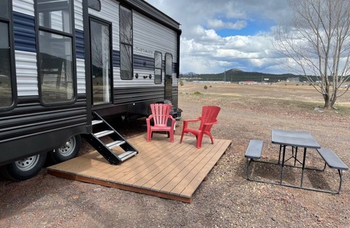 Your luxurious Grand Canyon RV Glamping experience awaits. We are located in the town of Williams, Arizona. The "Gateway to the Grand Canyon" and the location for the Grand Canyon Railway. We are a 54 mile drive to the Grand Canyon and prepared for any season! Bring your friends and family members to experience the outdoors in style at our Boutique Glamping Resort. This is a 1 Queen Bedroom, 1 Sofa Bed, and 2 Twins LOFT unit. There is 1 Large Bathroom. This unit has heating, air conditioning, a fireplace inside, and a full working kitchen with a fabulous island! Your home away from home. This unit has a Smart TV, deck, chairs, a grill, and a fire pit.