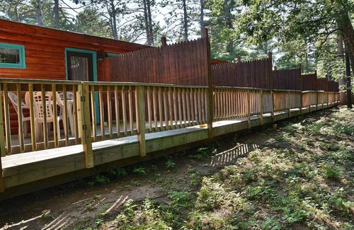 Grand Pines Motel includes ten motel rooms, located on Little Round Lake near Hayward, Wisconsin. These newly-remodeled motel rooms are the perfect lodging for everything from romantic getaways to outdoor escapes. Each of our comfortable, Northwood’s inspired rooms include two queen beds, a flat screen TV, a small refrigerator, microwave, a wet sink, a coffee maker, private deck off back, central air and whirlpool jets in the tub. Amenities