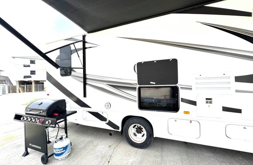 Stay in an RV parked and hooked up our Beachfront Resort with private beach access to Surfside Beach***OR**** we can park it for you directly on the beach for you to stay there with prior approval. Unit features Cold AC, 2 recliners, 3 firestick/roku televisions, wifi,exterior security cameras, electric indoor fireplace. Kitchen features include: double sinks, refrigerator/freezer, gas stove and oven, microwave, dishes and pans/cooking utensils. RV features a full size bed in the bedroom, Table converts to a twin bed and over cab contains an RV full bed. Linens, towels, and beach chairs, misc beach toys like horse shoes and football included. Also available are golf carts,surf boards and wave runners for rent.
