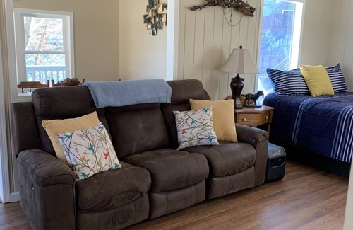 Comfortable queen beds (2), full kitchen, utilities, gas grill, table and chairs, sofa and smart TVs, full bathroom, deck with patio table. We have all the dishes, pots, and pans. Dock with boat slip and electric on the dock and trailer parking area. Beautiful sunrises, walk to Bagnell Dam, close to shopping, restaurants, and entertainment. All cabins have new linens and bedding and are very clean.