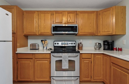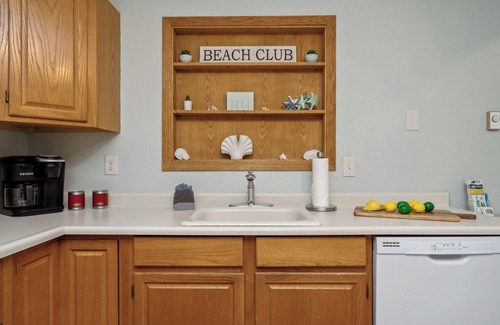 The main-level bedroom is thoughtfully designed for comfort, furnished with a plush queen-sized bed and a desk for quick escapes or remote work. The nearby bathroom, with a generous tub/shower combo, is perfect for unwinding after a day at the beach. A washer and dryer are provided for added convenience, along with detergents for your laundry needs.