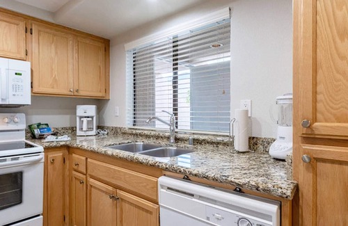 Inside, you’ll find a family room with a flat-screen cable TV and DVD player, complimentary Wi-Fi, and air conditioning to keep everyone comfortable. The fully equipped kitchen includes everything you need to enjoy meals together: a stove, oven, dishwasher, microwave, full-size refrigerator, drip coffee maker, toaster, and seating for six in the dining area.
