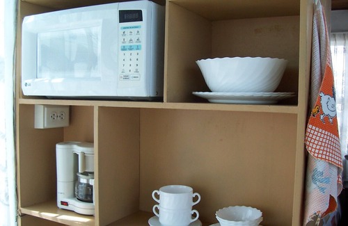 It has one Queen size bed. It has one full bathroom with shower, a little kitchen with stove (two burners), microwave, small fridge, coffee pot and appliances needed for the daily needs.