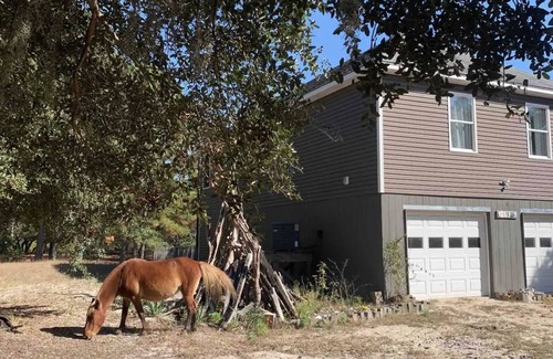 You may see wild horses in the maritime forest at the house or in the dunes on your way to and from the beach. There are often horses hanging out around the house (sometime taking a nap in the driveway!). The beach itself is a quick 10 min walk or a 3 minute drive away from the house and parking on the beach is permitted. A beach parking pass (necessary in the high season) is provided with the house rental.