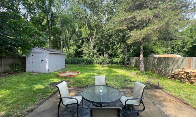 Outside features a fenced in yard, patio table, sandbox for kids, a firepit and adirondack seating.