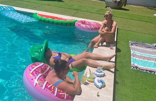 Pool of 11x6 meters and a maximum depth of 1.80 cm. with colored lights and artificial grass around the perimeter. 2 chillout beds with sun loungers, 1 Balinese chillout bed with mattress, 2 egg-shaped beds and nautical leatherette mattress,