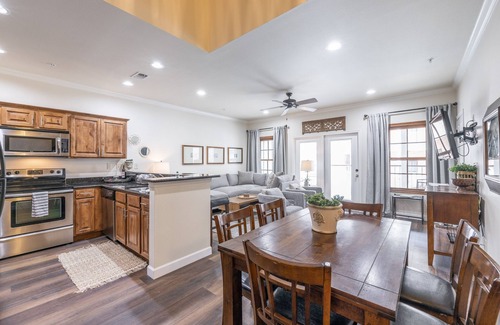 Enter the condo and head through the entryway where you'll be greeted by a large, spacious living area complete with cozy couches, an HDTV, and access to the lower patio. The quaint, cute kitchen features stainless steel appliances, all of the essential kitchenware, a coffee bar, and bar seating. Just off the kitchen area is the dining area complete with a table for 6.