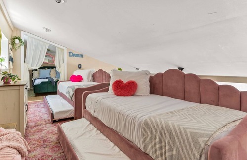 Our Guest House is a huge converted garage office transformed GH w/ large living space & open loft sleeping areas for up to 9. The upstairs loft sleeps 6, w/ a high end queen bed & two new tufted twin beds each w/ trundles. Downstairs we have 2 more new tufted singles daybeds (1 w/ a another trundle), to snuggly sleep up 9 total (ideal for families, old friends or retreats who don’t mind sleeping close).