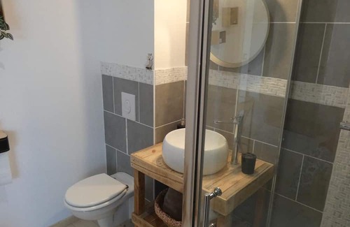 This stopover gîte is reserved for the bedroom only and not the entire gîte. Very bright upstairs bedroom with 1 140 x 190 bed and a 90x 190 bed. All the furniture in this room was made with pallet wood. As was the adjoining bathroom which has a shower, a sink and a toilet. Tourism and Handicap label (mental, motor, visual and hearing).