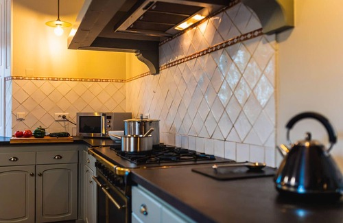 HACIENDA features 2 living rooms, that alone ! A large first living room with comfortable leather couches welcomes you from the entrance of the villa. There’s another small reading area with a fireplace (in winter by the fire, there’s no better place !), and the second living room with a flat screen TV, a stone fireplace and a pool table ! These spacious living areas are very pleasant and everyone can go about their own business in complete peace of mind ! HACIENDA’s kitchen is fully equipped and features all the equipment and utensils you need to cook like a Michelin’s star chef during your stay. Every single element composing this room makes the kitchen so unique and charming : the vintage American fridge, the wood cabinet, and the beautiful family wooden table. Our favourite thing is the period gas cooker which has been extremely well preserved !