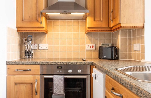 The cosy living area has comfortable seating to curl up on and a smart TV, there is also a dining area. The fully equipped kitchen has everything you need for both long and short stays, including a dishwasher and washing machine.