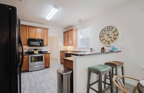 The full kitchen is fully equipped with everything you will need to enjoy a short or long term stay, and with a formal dining room, barstools, and a breakfast nook - there is no shortage of places to gather with family and friends. The open floor plan creates a spacious, inviting atmosphere, perfect for family gatherings or quiet moments of relaxation in Bluffton, SC. This short term rental also has a desk/workspace in the living room for those who may need to log-on during vacation. The primary bedroom offers a king-size bed, a smart TV, and a private en-suite bathroom, providing a peaceful sanctuary after a day of exploring. One guest room features a queen-size bed, while the other is furnished with two twin sized beds, ensuring plenty of space for everyone. For added convenience, guests have access to an on-site combination washer/dryer. Directly across from Oscar Frazier Park - which offers plenty of green space, walking paths, a playground, and seasonal splash pad - this home truly offers the best of Bluffton, SC!