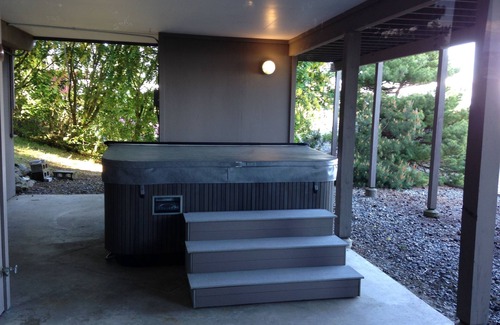 Outside on the covered patio is a huge 480 gallon J-375 Jacuzzi hot tub that accommodates 6 people, including one in a full chase-type lounge seat. This deluxe model has a built in radio and many lighting options, a waterfall, and comfortable built in head-rests, and easy opening cover lift that one person can open and close in a jiffy. Talk about relaxing, the 46 jets can be adjusted to just the perfect strength to provide a rejuvenating, relaxing, and pro-quality massage. Jacuzzi engineers even made sure to include jets for a foot massage! We leave the Jacuzzi in operation all 365 days of the year, but no matter when you use it, when you are done you will come out relaxed~