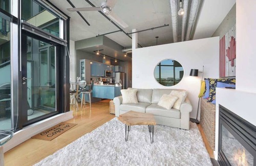 At first entry to the condo, you will be greeted with a beautiful view, featuring floor to ceiling windows in the living room. The subway tile in the shower to your right, pays an homage to the history of Victoria. The modern kitchen features a gas range, stacking washer and dryer, and all the luxuries of home. The bedroom and den both offer glass barn doors for privacy, while letting in all the natural light the condo has.