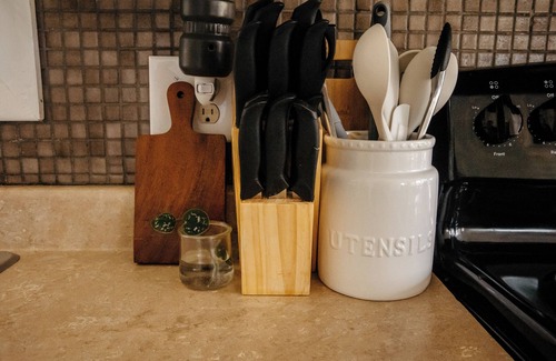 The fully stocked kitchen is complete with a dual fridge/freezer, microwave, electric range and oven, and Keurig coffee maker. You will also find the cabinets stocked with dishes, cutlery, cookware, bakeware, utensils and all the essentials for a home-cooked meal.