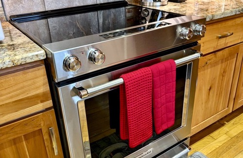 Enjoy the very comfortable pillows and Serta iComfort queen bed (many positions for head and feet with remote) for a great night's sleep. The cabin has beautiful quartz walls, granite counters and pine ceilings, with knotty cherry cabinets, and a stainless steel dishwasher and convection microwave.