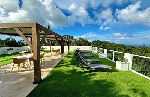 Rooftop veranda with dining, lounging and beautiful views of the rainforest and ocean!