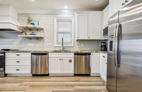 Inside, coastal chic interiors blend crisp neutrals with cheerful accents, setting the stage for both relaxation and celebration. A chef’s kitchen with quartz counters, stainless appliances (including double dishwashers), and ample prep space makes cooking for a crowd effortless. The top floor is every kid’s ultimate hangout: a bunk room turned arcade, complete with foosball, air hockey, and classic games. Multiple TVs, plush seating areas, and a family-sized dining table anchor the common spaces, ensuring that laughter and stories linger well into the night.