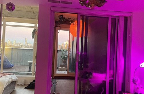 Unique loft style unit. Located in Toronto's best neighbourhood! Walk to Trinity Bellwoods, Parkdale, Ossington. Every must-try restaurant is near by and cutie coffee shops and cozy bars are tucked all along the way. Quick streetcar ride to Scotiabank Arena, Union station, Aquarium, CN Tower. Enjoy eating outside on the terrace with truly one of the best views I've ever seen in the city. Condo amenities include large/impressive gym, yoga room, and bbq area. A queen bed in the bedroom and a couch in the living room can sleep 3 comfortably. Washer, dryer, A/C, dishwasher, and everything you could need inside the unit. Basic cooking necessities and toiletries provided. Super clean, comfy space.