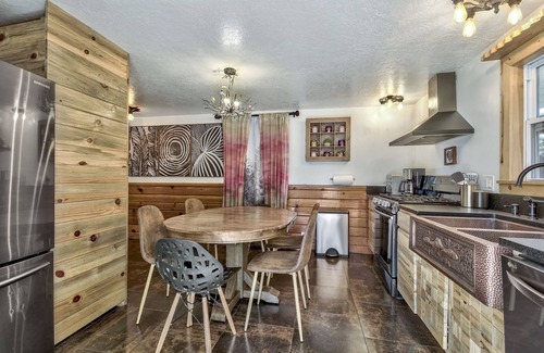 Rustic Art Deco kitchen with hand crafted woodwork, a copper sink, and stainless steel appliances. Enjoy fresh organic produce from Whole Foods or the Ski Run farmer’s market just around the corner, and dining under the bird nest Chandelier.