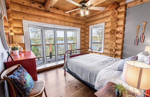 - Bedroom 1/Master: 16’x16’ | Sleeps 2 | King Bed | Amazing Stone Fireplace (wood burning) | Beautiful Lake View with patio door to the massive deck