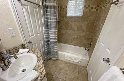 The two bath home has tiled bath/shower units with tiled floors. You never have to feel as though you are invading someones private home they rent out when they're not using it. The kids, and young at heart may enjoy a game of basketball on our mini full court.
