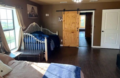Come rest at The Hideaway after a self guided tour of Main Street, a day out at Possum Kingdom Lake, or a quick shut eye before a fishing tournament at Hubbard Creek Lake. This barndominium has everything you need to get away and relax for a while. You'll love this unique escape! Catch and release farm tank, beautiful sun rise & sun sets, and additional pens that you can stall your horses for horseback riding on the ranch. Bring your 4 wheeler or just come to relax and be romantic!