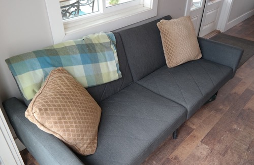House features a queen size bed, foldable futon to sleep kids, indoor fireplace, wall hooks, a coffee table, porta potty, fire pit and grill, outdoor dining table, wraparound porch, and a barrel of water for washing hands.