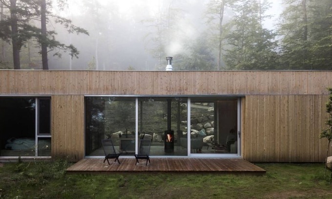 drawing inspiration from scandinavian minimalism and japanese design, the two bedroom, one bathroom cabin embraces an open-concept floor plan. the main living space is surrounded by floor-to-ceiling windows and is centered around a rotating wood stove that provides 360-degree access to the fire. every piece in the interior is carefully selected to focus on the importance of nature. check-in and gaze at the mountains, unwind with a book, listen to the sounds of the forest and cook to the calming crackling of the fireplace. wake up to light seeping through wooden shutters, which are adjustable from the exterior of the house to achieve the desired privacy and light allowed into the space.