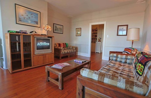 With a retro late '80s and '90s design and an open floor plan, this cozy retreat is perfect for games, TV, and shared meals.