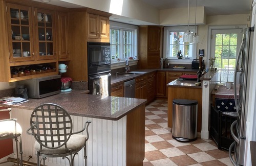 Built in 1800 as a ship builder's home on 8.5 acres, this property boasts a PRIVATE pier and inground pool. The house has two wood stoves, a fully remodeled and equipped kitchen, a large jacuzzi tub with flat screen TV in master bath. There are lovely views of the grounds, hills and water from the entire back and side of the home. Perfect home for families. Large windows in the master bedroom make it easy to spot bald eagles and gaze at the water for hours! This house, on the edge of town has plenty of space to walk , hike or bike. The new walking/biking trail which goes into the town center is right at your doorstep. It is also directly across from a nature preserve with walking trails. A private pier on our waterfront allows for wonderful salt water dips on warm afternoons and is great for nature watching.