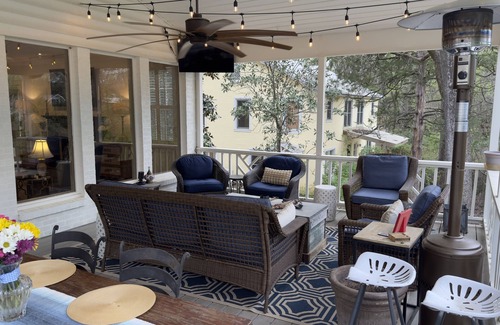 The back porch is spacious with a dining table for 6, a couch, and 4 chairs. A large fan, heated lamp, and TV are located on the back porch. Totally quiet area for family or friends.