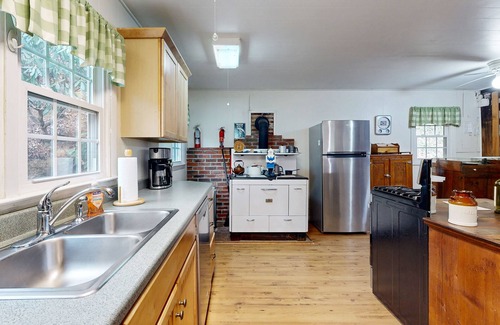 Come stay in this renovated 1930s log cabin! Enjoy the privacy of the yard with its green surroundings and a babbling brook that cascades down the property’s hillside. Cook meals in the fully equipped kitchen or out on the deck with the propane grill. Gather around and enjoy the satellite TV and surround sound system. Cozy up in front of the gas log fireplace in the living room or the wood stove in the bedroom.