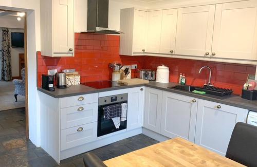 The spacious modern kitchen boasts slate flagstone floor with a large oak dining table (extendable to 6+persons) overlooking the mill grounds. Kitchen is fully equipped with dishwasher, induction hob and cooker, microwave, kettle, Nespresso coffee machine, four-slice toaster, washing machine and large fridge-freezer.