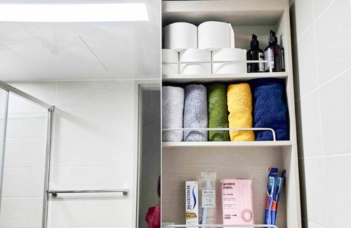 Our bathroom is thoughtfully designed with convenience and comfort in mind. It features a dry floor design, eliminating the need for shoes inside, and is stocked with large US-sized bath towels for your comfort. All essentials are hiding behind the mirror and high-tech toilet with a heated bidet with 12 different functions with remote control.