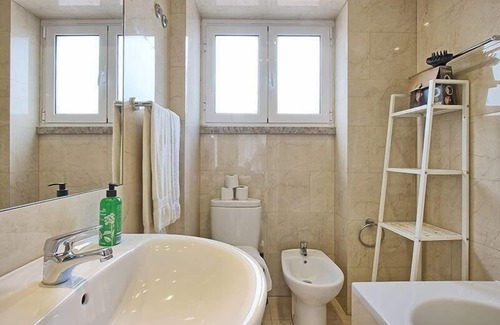 Inside, the apartment is well-equipped to ensure a comfortable stay. Each of the four bedrooms is designed to provide a restful night's sleep after a day of adventures. The two bathrooms—one with a shower and the other with a bathtub—cater to the preferences and needs of all guests. Convenience is key, with a Ceran hob, filter coffee machine, dishwasher, and electric kettle in the kitchen, and a washing machine available for guests' sole use throughout their stay. Meanwhile, fans in each room keep the environment cool and pleasant, regardless of the bustling Lisbon heat outside.