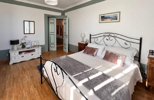Owing to the stairs, the apartment is not suitable for wheelchair users. The apartment is on the second floor, the top floor of Palazzo Urbani. On the ground floor and first floor there are trompe l’oeil paintings simulating a view of fantastic buildings and scenes, but in the attic apartment this was not necessary, as the view you enjoy is reality and quite incredible, unobstructed in all directions towards many smaller and larger localities in the hilly landscape of the region, the white sails of the Adriatic Sea, the majestic Monti Sibillini. You can experience the fragrances of spring, as well as autumn fog, the colours of the sunrises and sunsets, different every day. It is a place where you can get to know a very special way of life, quite antique and yet so modern. 200m² of total peace and quiet, but at the same time a starting point for exploratory tours in the Marche, a beautiful and unassuming region.