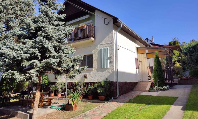 The holiday apartment is located in a single-family home, was renovated in 2021 and is furnished in a rustic style. The property is located on the outskirts. Also due to its quiet and sunny location the domicile is popular. Available for shared use: barbecue facilities, pavilion, garden furniture and Hollywood swing. Trampoline, children's bikeLocationSiofok. The holiday apartement is located on a 150 sqm enclosed garden plot with meadow, flowers, shrubs and trees, bordered by a fence. The landlord lives permanently in the house, but uses a seperate entrance. Other apartments in the same house. Access is via a side road (asphalted). Parking (for 1 car) is available on the property. Specialair conditioning.Facilities: children's toys and internet access (WLAN). TV reception takes place via electric wire.For your safety, the accommodation is equipped with smoke detector. Leisure2 bicycles. Dogsallowed, EUR 5.00/pet per day. DistancesShopping 300 m, restaurant 500 m, town center 3 km. In summer: Balaton 700 m in Siofok (beach 700 m in Siofok featuring meadow). DivisionHoliday apartment, 1 floor, 2 rooms (including 2 bedrooms), 62 sqm, in total 5 beds (including 1 additional bed). RoomThe entrance to your holiday apartment is located on the ground floor, is at ground level and leads over the 6 sqm terrace directly into the hallway. Kitchen with dining area (4 seats), gas stove (2 flames), oven, fridge (180 l, icebox), microwave, coffee machine and electric kettle. Bathroom with shower, 1 washbasin, WC and window. Bedroom with 2 single beds and TV. Bedroom with 2 single beds and 1 additional bed on sleeping accommodation. Terms of lease and pricesIncluded in the priceinternet access, air conditioning, parking place, electricity, gas, water, final cleaning, bed linen, Wireless Internet access. Side costs-Costs on the spot:/Obligatory:local tax by local tariff.Deposit:EUR 100,-/object