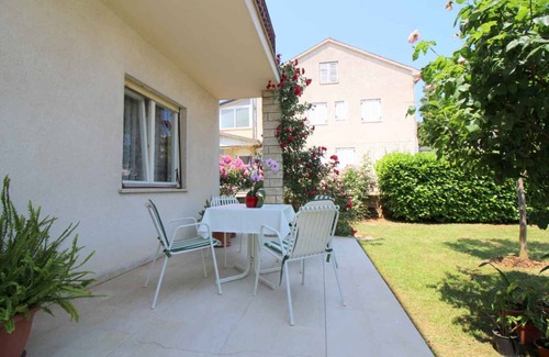 The holiday apartment is located in a single-family home and is furnished in a modern style. The property is located in a residential area, on the outskirts. Also due to the view over a panorama from the property and its quiet and sunny location the domicile is popular. Available for use: sunbathing lawn, terrace, garden furniture and courtyard. Outdoor dining areaLocationFuntana. The holiday apartement is located on a 500 sqm enclosed garden plot with flowers, bordered by a hedce. The landlord lives permanently in the house, but uses a seperate entrance. Access is via a side road (asphalted). Parking (for 1 car) is available on the street in front of the house. Specialair conditioning.Facilities: internet access (WLAN). TV reception takes place via satellite. Dogsnot allowed. DistancesShopping 300 m, restaurant 50 m, town center 300 m. doctor, pharmacy each 500 m in Funtana. airport in Pula 55 km. Children's playground 200 m. Sports facilities at Hotel Funtana 500 m. Vrsar 2 km Porec 6 km. In summer: Adriatic Sea 150 m in Funtana (beach 200 m in Funtana beach featuring gravel, rocks and bathing plateaus). horse riding in Bijela Uvala 1500 m. boat launch in Funtan 300 m. dog beach, boat rental each 500 m in Funtana. Sport Hotel Funtana: tennis, water sports each 200 m. mini golf 500 m. golf in Umag 40 km. DivisionHoliday apartment, 1 floor, 3 rooms (including 2 bedrooms), 100 sqm, in total 4 beds. RoomThe entrance to your holiday apartment is located on the ground floor, is at ground level and leads directly into the vestibule with doors to all rooms. Common room (25 sqm) with TV, fireplace, (6 seats) and access to the terrace (15 sqm, covered, garden furniture, 1 table, 4 chairs, parasol). Bedroom (10 sqm) with 1 double bed. Bedroom (13 sqm) with 1 double bed. Kitchen in the kitchen-diner (10 sqm) with electric stove (ceramic hob, 4 plates), oven, extractor hood, dishwasher, fridge (icebox), microwave, coffee machine, toaster, electric kettle and access to the terrace. Bathroom with bathtub, 1 washbasin, WC, bidet and hairdryer. Terms of lease and pricesIncluded in the priceinternet access, air conditioning, electricity, water, final cleaning, Bed linen (weekly change), Wireless Internet access. Side costs-Additionally(Payable when booking)/registration fee obligatory 12,50 € per person per stay. local tax.Deposit:EUR 100,-/object