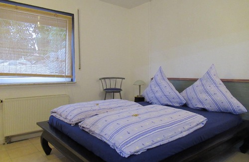 The apartment has two bedrooms, a living room with a sofa bed and a dining corner, a bathroom and a kitchen, totaling around 75m² of living space for 2-6 people. The contemporary apartment is fully-furnished and is situated on the ground floor. The entrance is to the rear of the house facing the garden and south. The apartment is non-smoking. The kitchen is equipped with a fridge-freezer, oven, electric stove, dishwasher, microwave, kettle, toaster, coffee machine and radio. One of the bedrooms and the living room have a TV with a satellite receiver and DVD player. The bathroom has a shower, WC and hairdryer, as well as a washing machine and a clothes stand.
