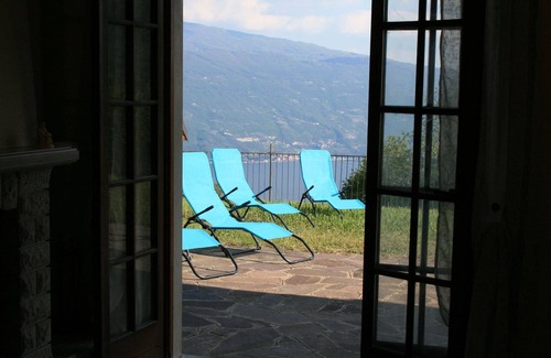 La finestra sul lago: 75 m2 flat with lake view, garden on the ground floor, private parking space located in a villa with a large garden surrounded by greenery where you can enjoy peace and quiet. It is located 2 km from the main centre, and enjoys a view of Lake Garda and Monte Baldo.