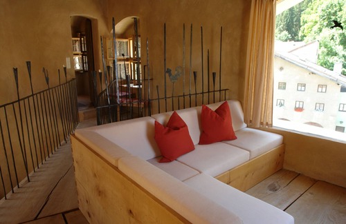 The tower saloon, in the roof of the tower, offers space for five guests over three living levels. On the first floor level there is a, up to the visible attic, open area with dining area, fireplace, tiled stove, fitted kitchen and vaulted dome with bathroom. The bathroom includes the luxurious whirlpool tub, vanity and red glass shower and a large rain shower. In the small tower room on the same level, not only our youngest guests find their cuddly realm. The stairs lead up to the bedroom with solid wooden bed and niche in front of the window to the castle courtyard. The uppermost living level in the Turmpalais is a gorgeous living gallery with exclusive sitting area. As the highest point in the tower, it offers magnificent views over the rooftops of Trostberg. A wooden bridge leads to the third bedroom with a romantic four-poster bed. The picturesque patio in its own arcade is an enchanting place with an open fireplace and incomparable views.