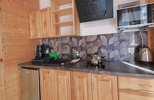 Room with kitchenette (fridge, microwave,coffee maker, sink, ceramic hob, extractor hood, kettle, set of pots, dishes and cutlery and table and chairs )